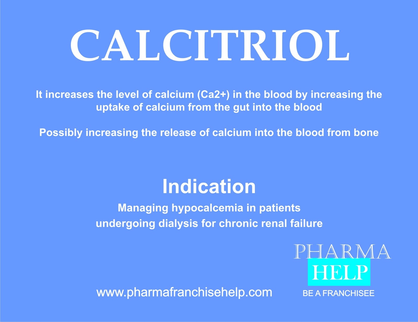 Raw MaterialCalcitriol :admin June 7, 2016June 7, 2016Leave a Comment on Calcitriol : Calcitriol : It increases the level of calcium (Ca2+) in the blood by increasing the uptake of calcium from the gut into the blood. Indication : Managing hypocalcemia in patients undergoing dialysis for chronic renal failure. Related